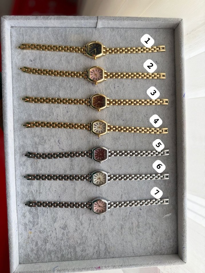Altı adet altın ve iki adet gri zincir detaylı klasik küçük altıgen kadranlı kadın saatleri, retro ve karşı kültür tarzını yansıtıyor. ⌚