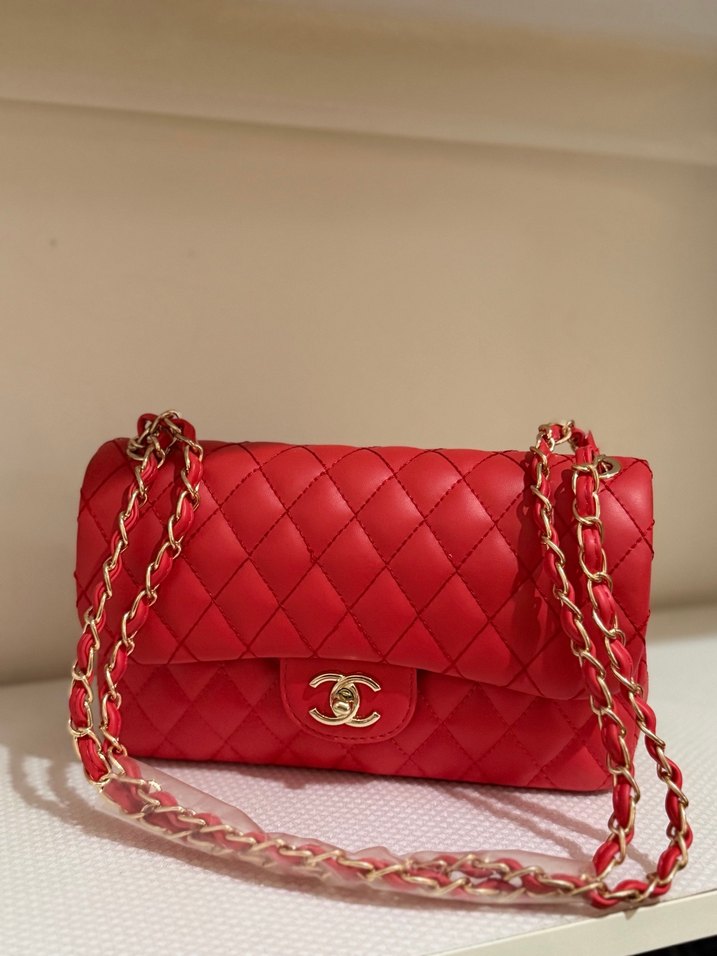 Kırmızı deriden yapılmış, zincir detaylı kapitone desenli klasik ve modern tarzda çanta. Canlı renkleriyle günlük kullanıma uygundur.
