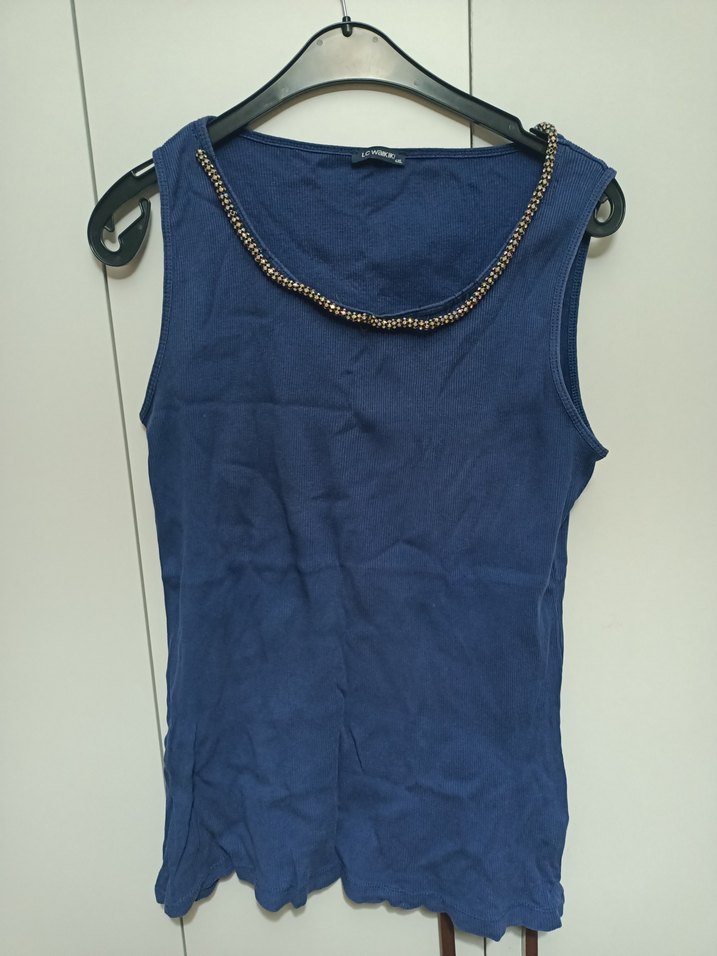 Lacivert kolsuz yelek, keten kumaştan, zincir detaylı yuvarlak yaka ve dar kesim, günlük rahat kullanım için uygun.