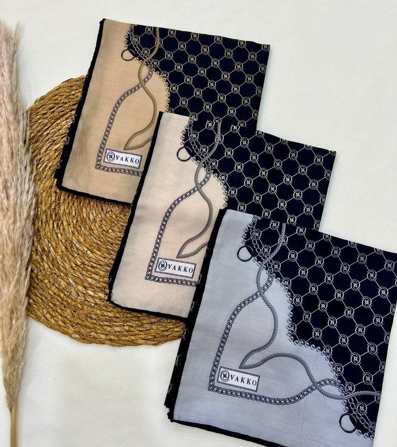 Kadınlar için koyu gri renkli, zincir detaylı sentetik kumaştan yapılmış, konvansiyonel tarzda, rahat ve mütevazı bir eşarp. Vakko marka logosu bulunur.