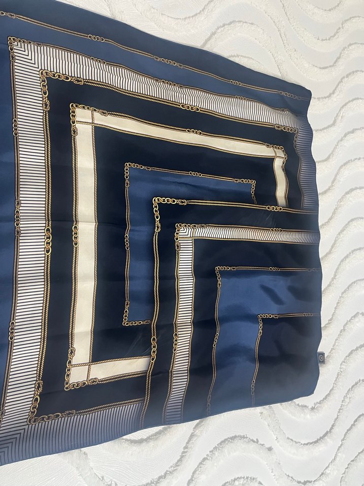 Kadınlar için koyu mavi renkte, zincir detaylı ve yumuşak sentetik kumaştan yapılmış fular. Klasik zarafeti Parisli bohem tarzıyla buluşturur.