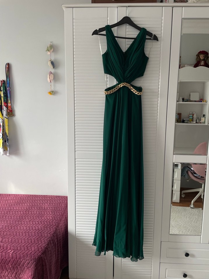 Koyu yeşil, v yaka, kolsuz ve zincir detaylı bel kısmıyla klasik ve şık uzun abiye elbise. Sadece 1 kere giyildi. Beli daraltıldığı için 32 beden'e tam olur.