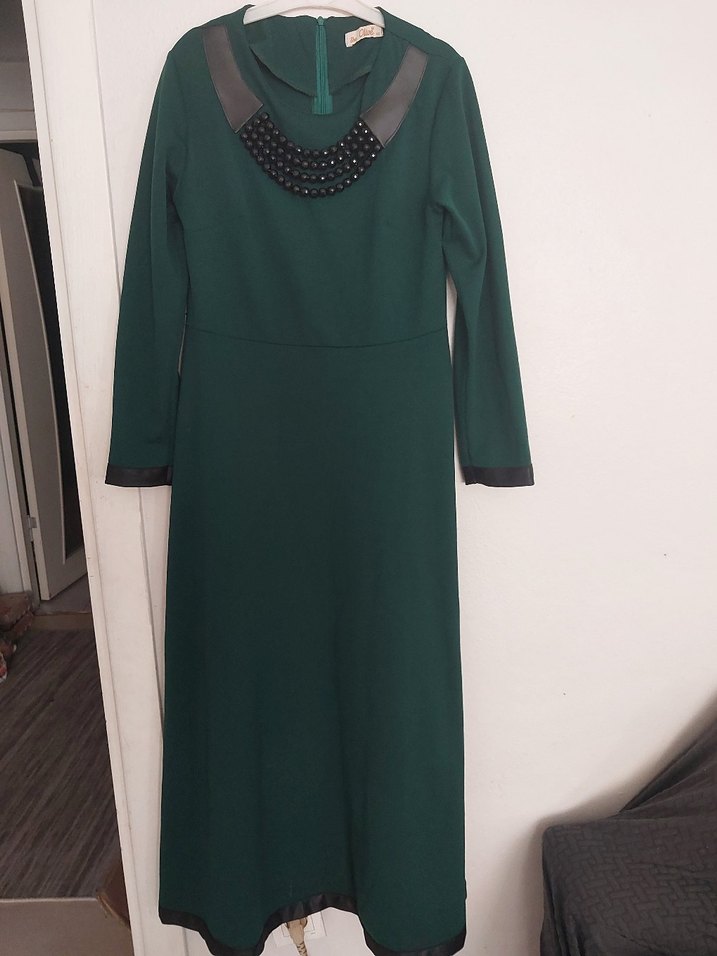 Koyu yeşil renkte, uzun kollu ve bisiklet yaka bir elbisedir. Zincir detaylarıyla klasik ve şık bir görünüm sunar. Ofis kullanımı için uygundur.