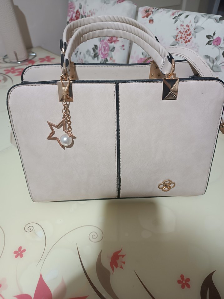 Zincir detaylı, baskılı beyaz deri kadın çantası. Modern klasik tarz ve Paris esintisiyle günlük kullanıma uygun. ✨