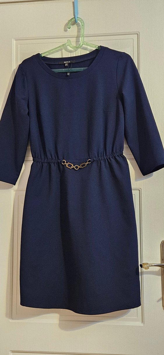 Lacivert, zincir detaylı, midi boy, yuvarlak yaka, klasik şıklıkta, ofis için uygun, dar kesim elbise. omuz 38 cm, göğüs 48 cm, boy 85 cm.✨