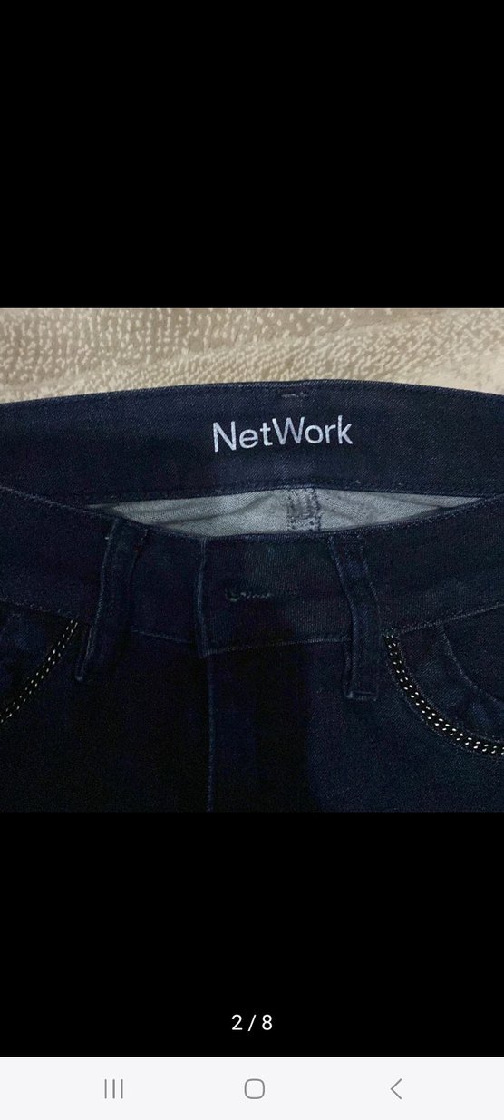 Lacivert denim kumaştan, zincir detaylı ve baskılı desenli, günlük kullanıma uygun fit kesim kadın kot pantolon. Marka: NetWork.