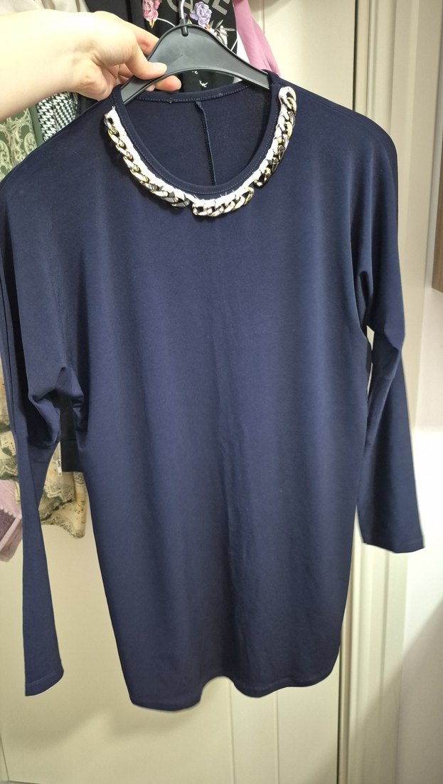 Uzun kollu, yuvarlak yakalı, zincir detaylı, parlak mavi renkte, ipeksi dokulu, rahat kesim midi tunik.