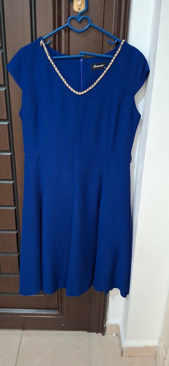 mavi midi elbise, zincir detaylıdır. Kolsuz, . Ofis kullanımına uygundur.