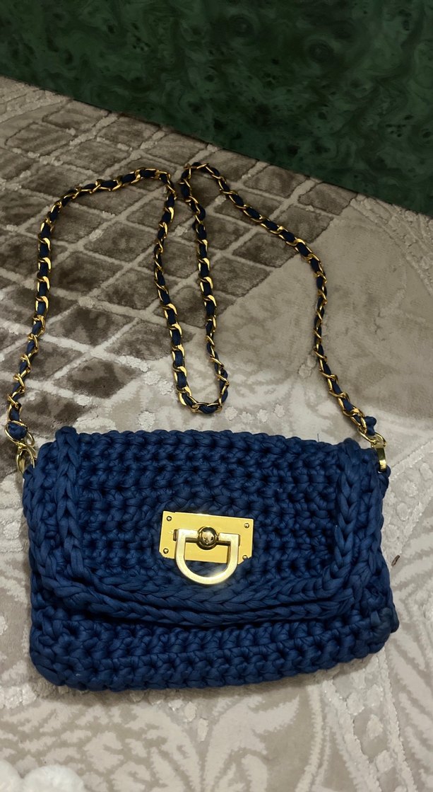 Lacivert örgü dokulu, zincir detaylı ve altın renk toka ile günlük kullanıma uygun bohem tarzda kadın çantası.