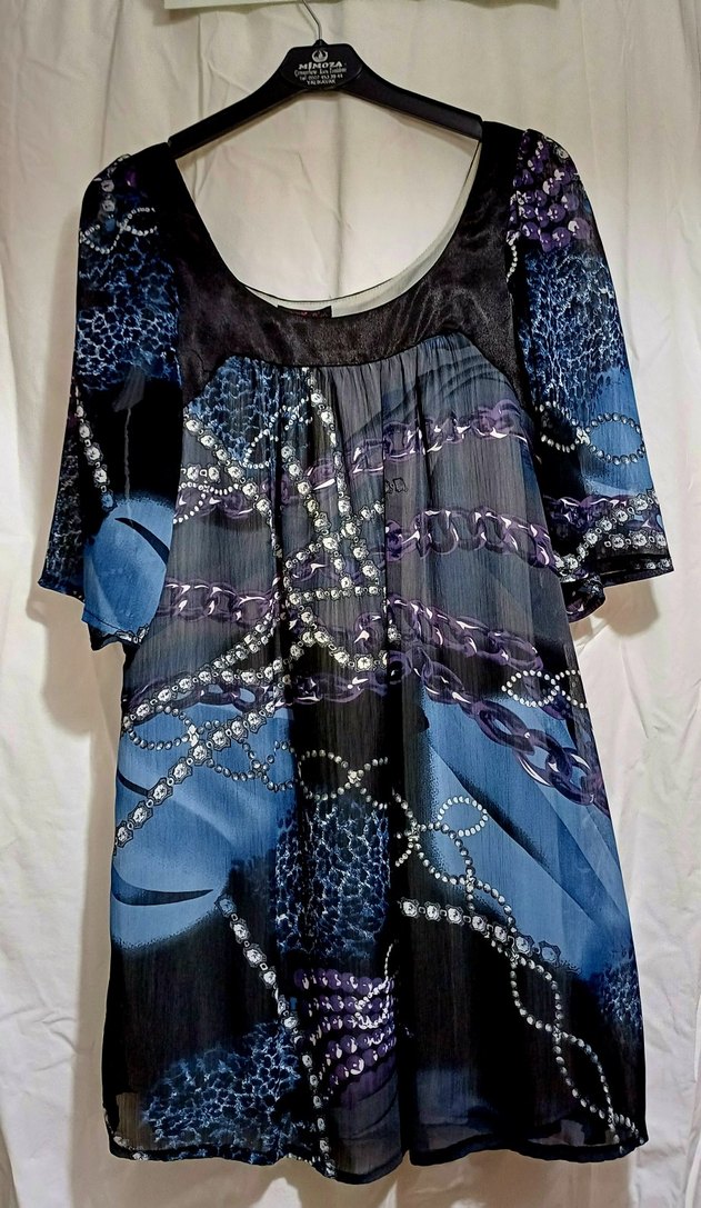Lacivert tunik, zincir detaylı, kısa kollu ve salaş kesimdir. Sentetik kumaştan yapılmış, koyu renkli batik desenlidir ve bohem parti tarzına uygundur.