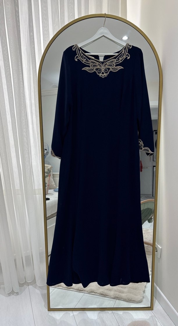 Lacivert uzun elbise, ince kesim, uzun kollu ve yuvarlak yaka. İpek gibi kumaş ve zincir işlemeli detaylara sahip, düğünler için uygun.