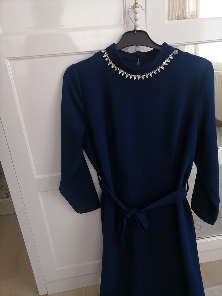 Zincir detaylı yakası, uzun kollu ve beli kuşaklı, parlak lacivert, klasik Paris tarzında modern kesim gece elbisesi. Ürün boyu 134 cm, kol boyu 55 cm, koltuk altı tek taraflı 54 cm dir iyi durumda defo yok 3, 4 kez giyildi. Ürün rengi ilk görseldeki gibidir