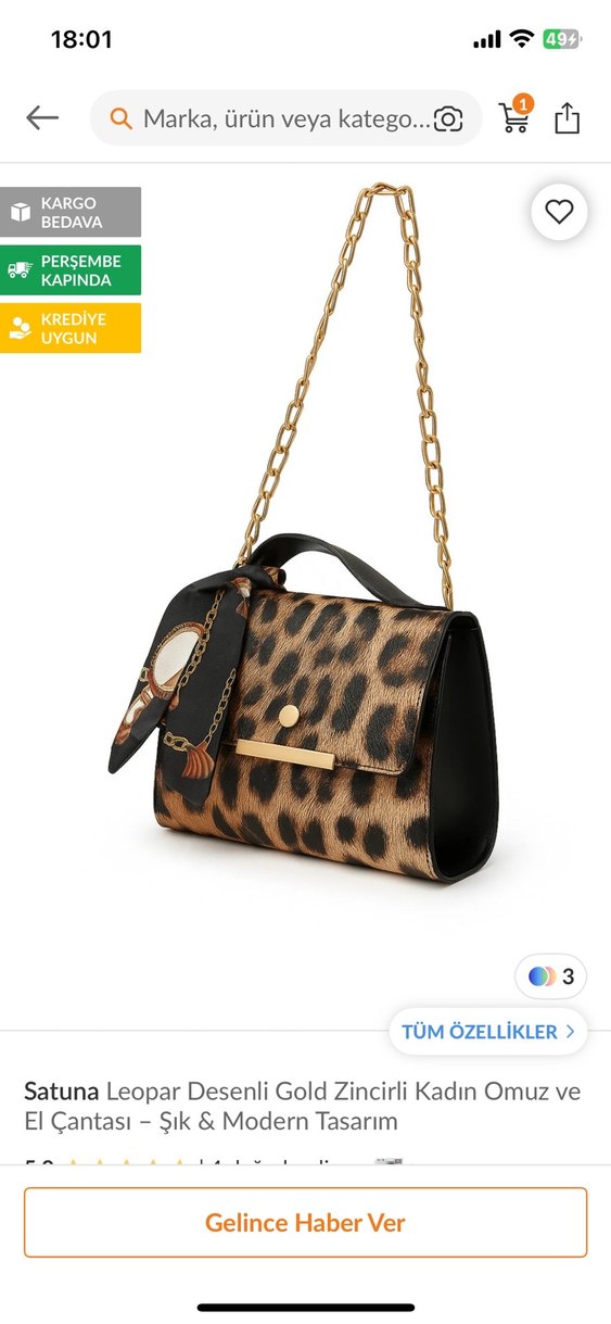 Kadın çantası, parlak kahverengi deri üzerinde leopar deseni ve altın zincir detayıyla. Günlük kullanıma uygun çağdaş tarzda, dekoratif fularlı, Paris tarzı şık ve rahat bir model. ✨