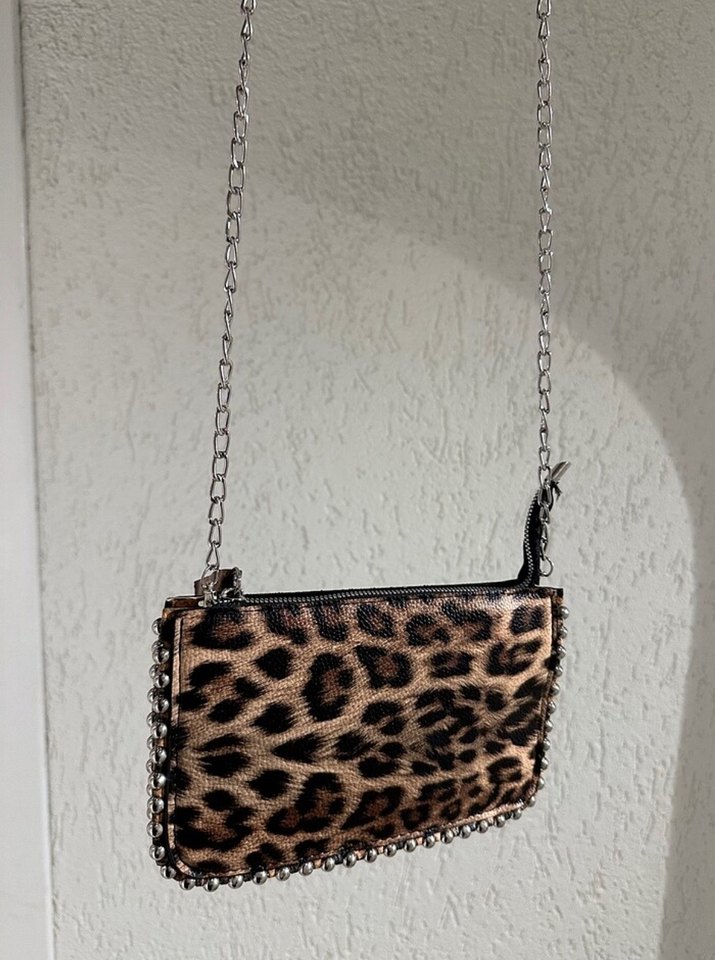 Kahverengi deri çanta, leopar desenli ve zincir detaylıdır. Bohem tarzı ve sokak modasına uygundur.