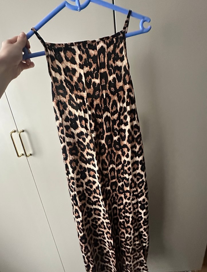Zincir detaylı, leopar desenli koyu kahverengi uzun ve vücuda oturan elbise, halter yaka ve ince askılarla günlük rahat sokak stili için uygun.