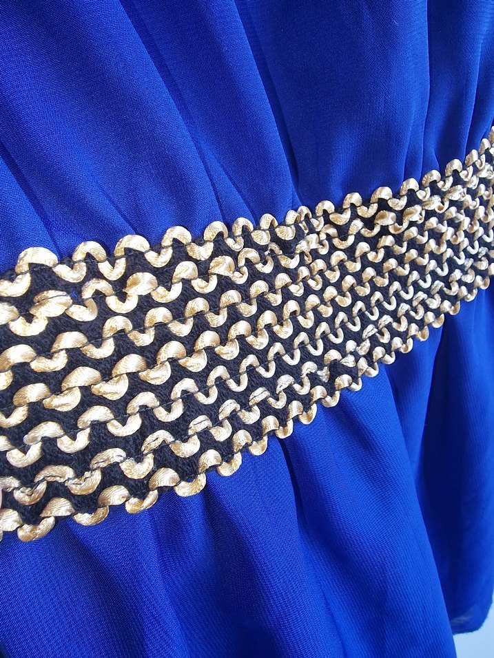Uzun ve vücuda oturan mavi tekne yaka ve askılı kollara sahiptir. Zincir detayları ve parlak işlemeli kumaşı ile bohem avant-garde tarzını yansıtır.