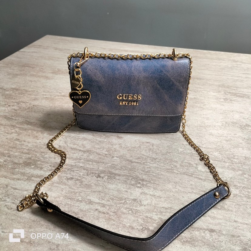 Zincir detaylı, baskılı desenli mavi denim kadın çanta. GUESS markalı, gri tonlarında, klasik Paris sokak modası stilinde. Günlük kullanıma uygun. yeni ambalajlı