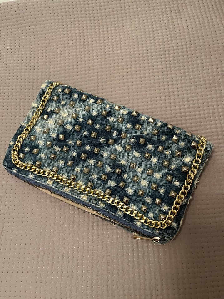 Parlak mavi denim üzerine batik desenli, zincir detaylı ve çivili rock punk tarzı kadın çantası. Günlük kullanıma uygun.