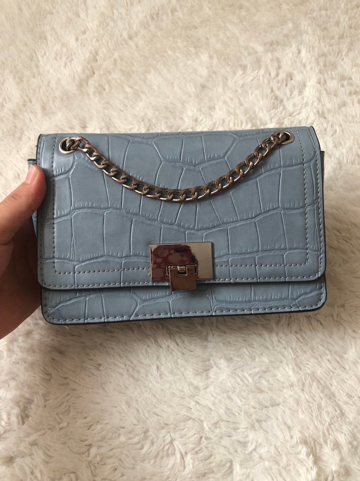 Pastel mavi deri ve yılan desenli, zincir detaylı kadın çantası. Modern klasik tarzı ve trend günlük görünümüyle günlük kullanıma uygun.