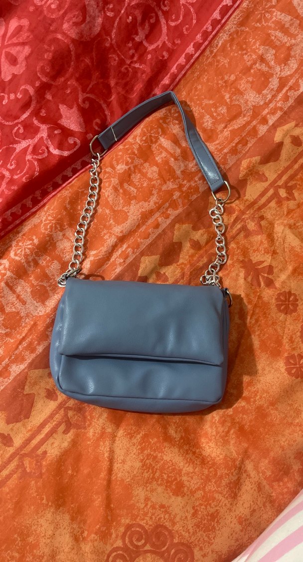 Zincir detaylı, mavi deri kadın çanta, minimalist tasarımıyla günlük kullanıma uygun, trend sokak stiline uyum sağlar.