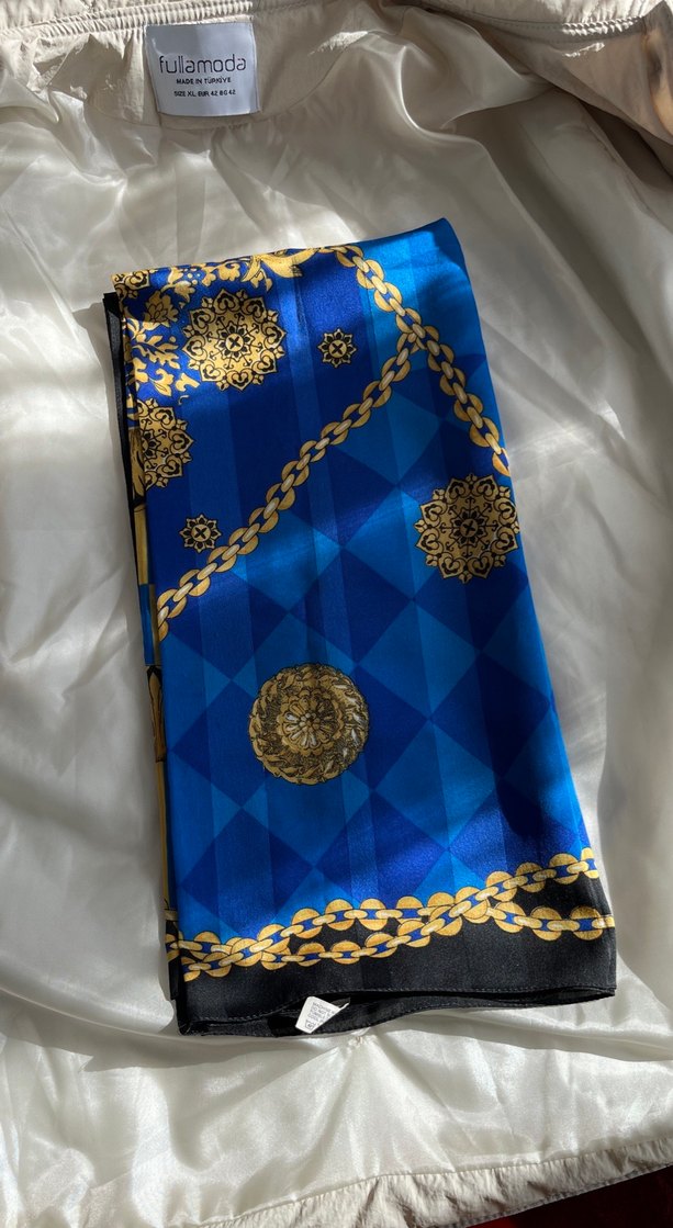 Kadınlar için mavi renkte, zincir detaylı ve ipeksi dokulu bu eşarp,bohem ve retro tarzı yansıtır. Klasik dokunuşlar için uygundur.