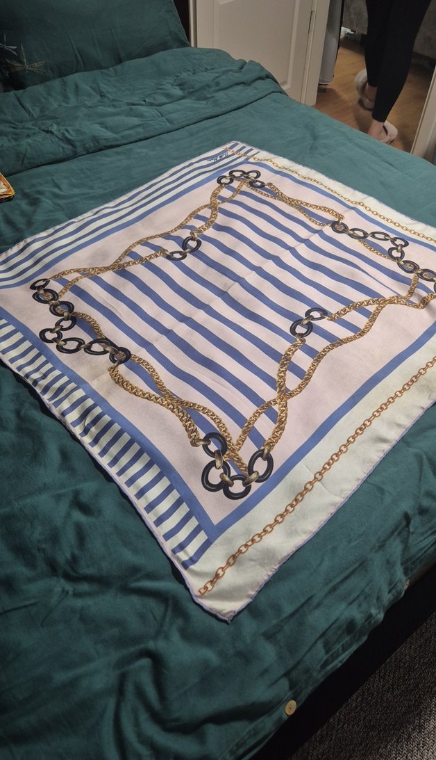 Bu kadın eşarp mavi-beyaz çizgilerle ve parlak zincir detaylarıyla ipeksi dokuda, Paris tarzını yansıtıyor. asla iade kabul etmiyorum çalıştığım için uğraşamıyorum sorarak alım yapınız