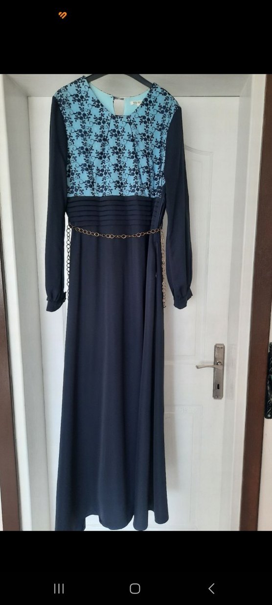 Yüksek yakalı, işlemeli desenli ve belde zincir detaylı uzun mavi elbise. Uzun kollu, bol kesim ve sentetik kumaştan, günlük kullanıma uygun.