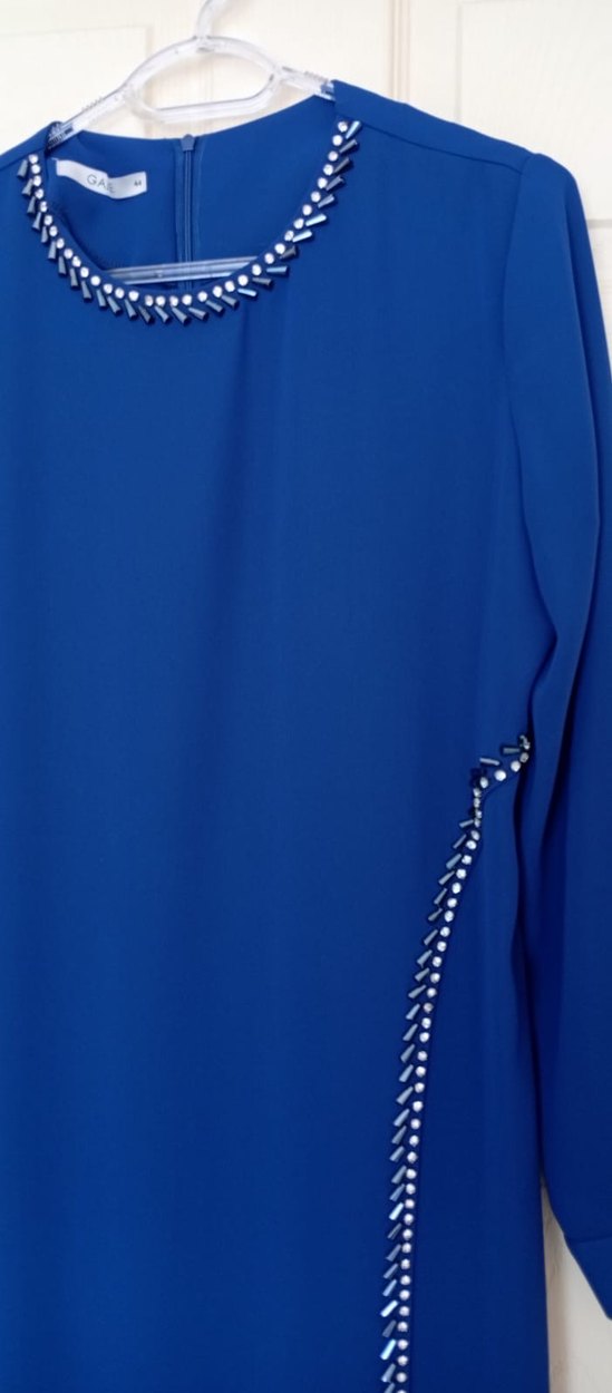 Mavi renkte, zincir detaylı ve nakışlı desenlere sahip kadın tunik. Tekne yaka, uzun kollu, sentetik kumaştan, parlak görünümlü ve uzun kesim.