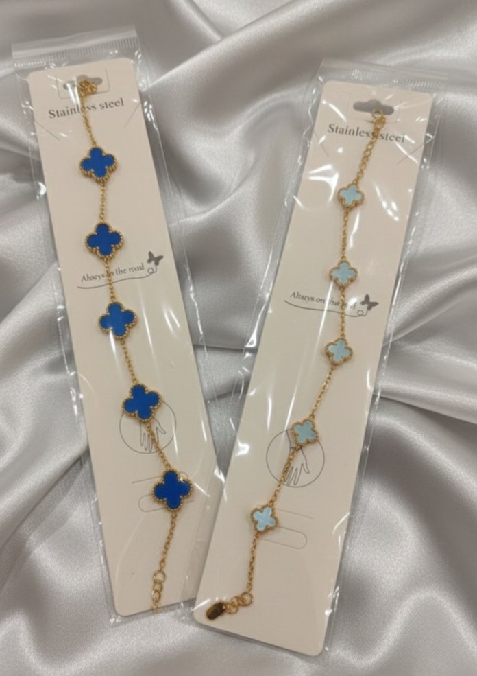Mavi işlemeli yonca detaylı, zincir tasarımlı kadın bileklik, günlük kullanım ve minimalist tarz için uygundur.