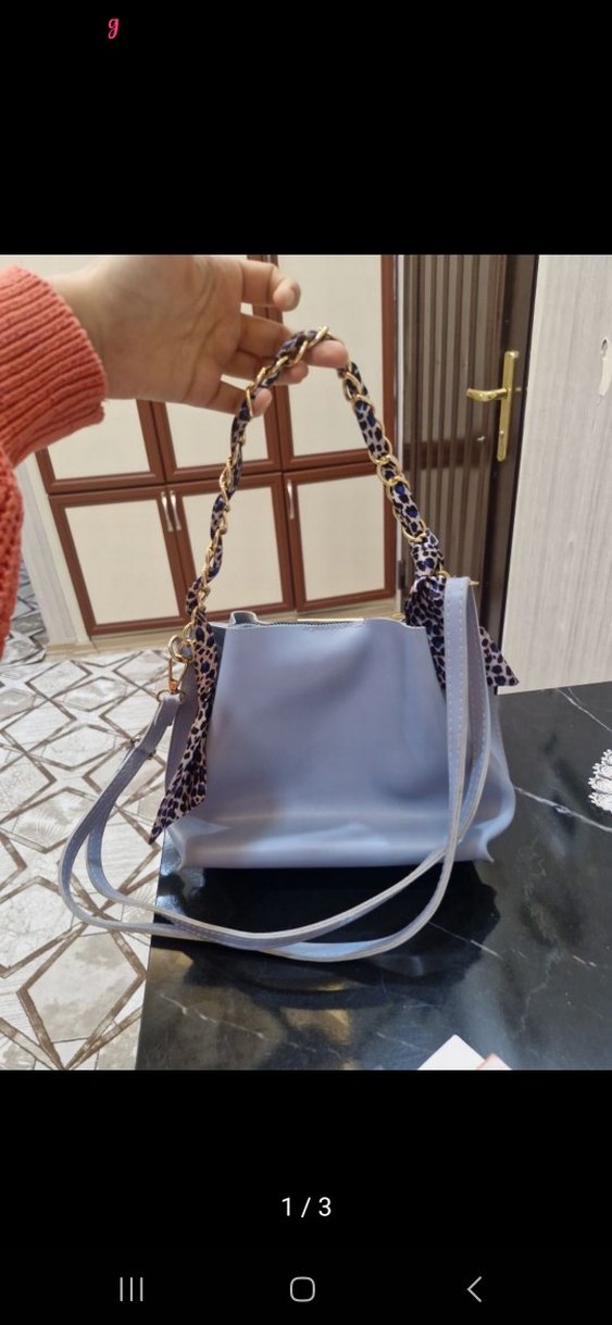 Mavi sentetik kumaş ve zincir detaylı, günlük kullanım ve sokak stiline uygun kadın çantası.