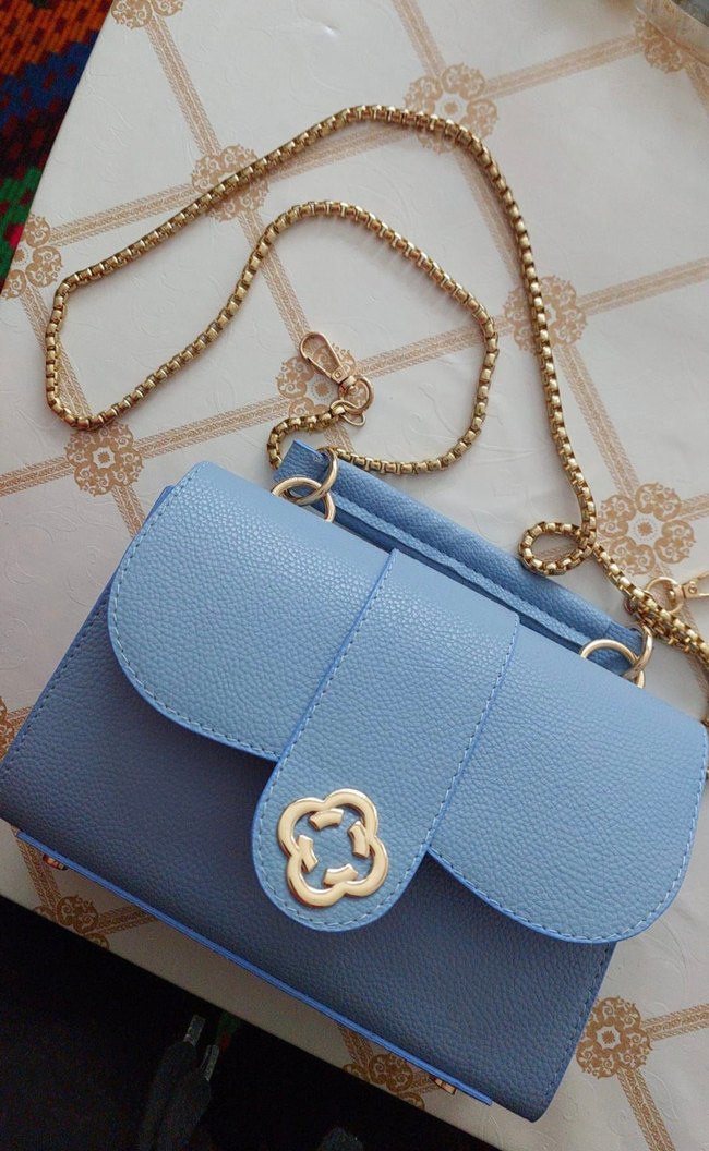Pastel mavi renk, zincir detaylı kadın çantası. Modern klasik tarzda, Parisian zarafetini yansıtan baskılı tasarım, günlük kullanıma uygun.