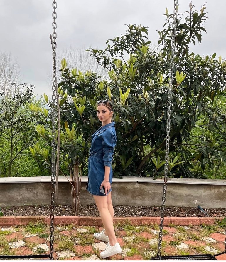 Mavi kot kumaştan, zincir detaylı, yakalı ve askılı kollu, rahat kesim mini elbise. Sokak stili için uygun, dış mekan kullanımı için ideal.