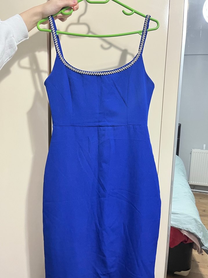 V yaka, zincir detaylı, kolsuz ve vücuda oturan mavi midi elbise. Minimalist ve klasik şıklığı yansıtır, partiler için uygundur.