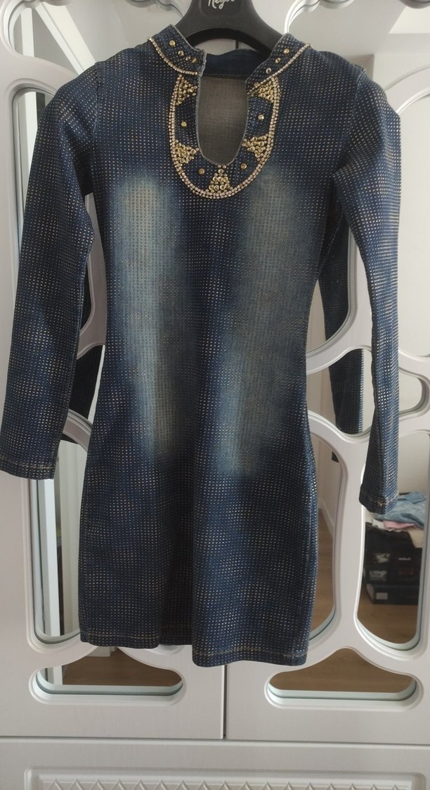 Zincir Detaylı Mavi Midi Kot Elbise
