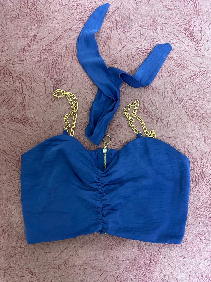 Parlak mavi mini büstiyer, zincir detaylı askılar ve halter yaka ile öne çıkar. Sokak stili ve partiler için uygun.