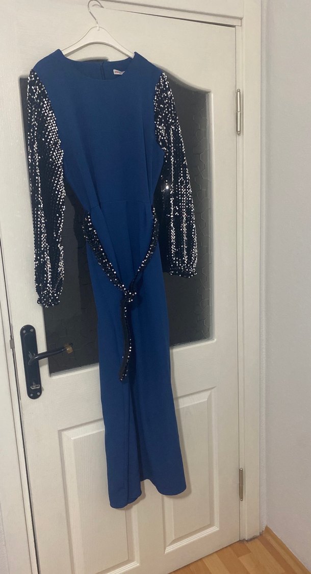 Zincir Detaylı Mavi Uzun Abiye Elbise