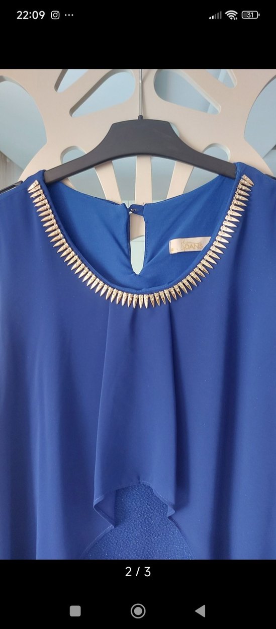 Mavi renkli, zincir detaylı V yaka uzun abiye elbise. Kolsuz, bol kesim ve parlak baskılı kumaştan, modern ve şık bir tasarım sunar.