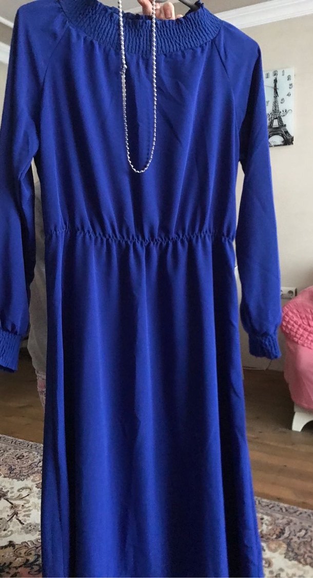 Mavi uzun elbise, zincir detaylı ve uzun kolludur. Rahat kesimi ve parlak saten kumaşıyla günlük kullanıma uygundur.