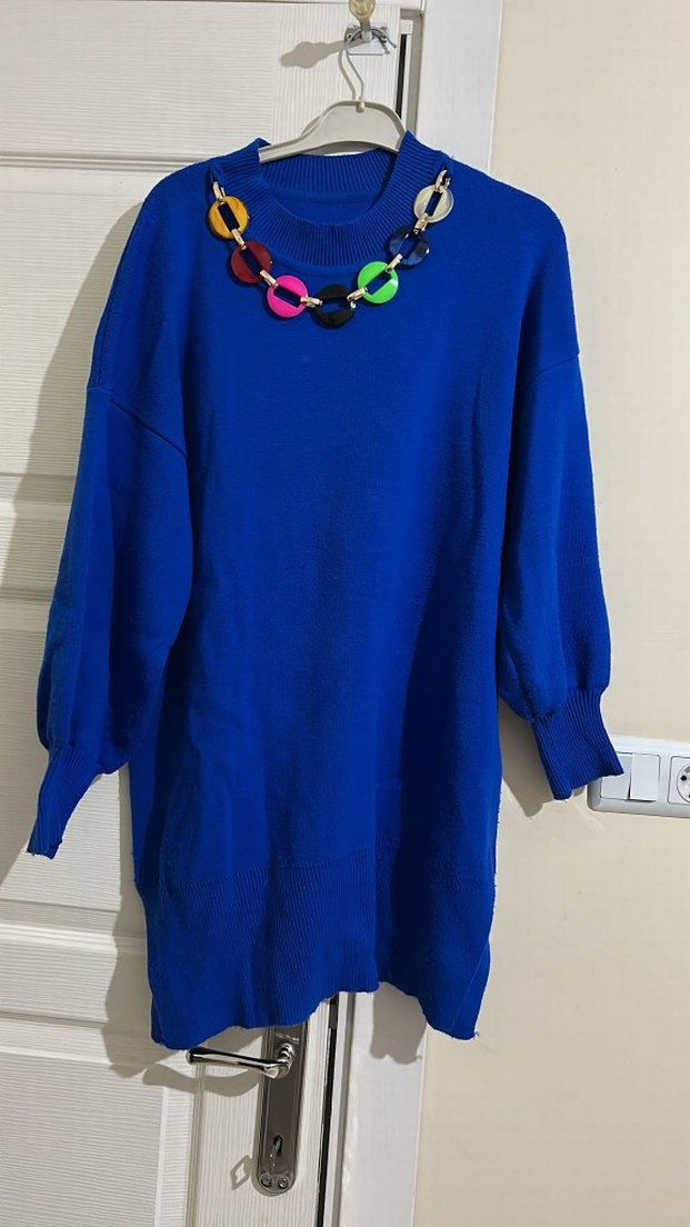 Uzun, bol kesim mavi triko, bisiklet yaka ve renkli zincir detayı ile. Yumuşak, sıcak kumaştan üretilmiştir, günlük kullanıma uygundur.