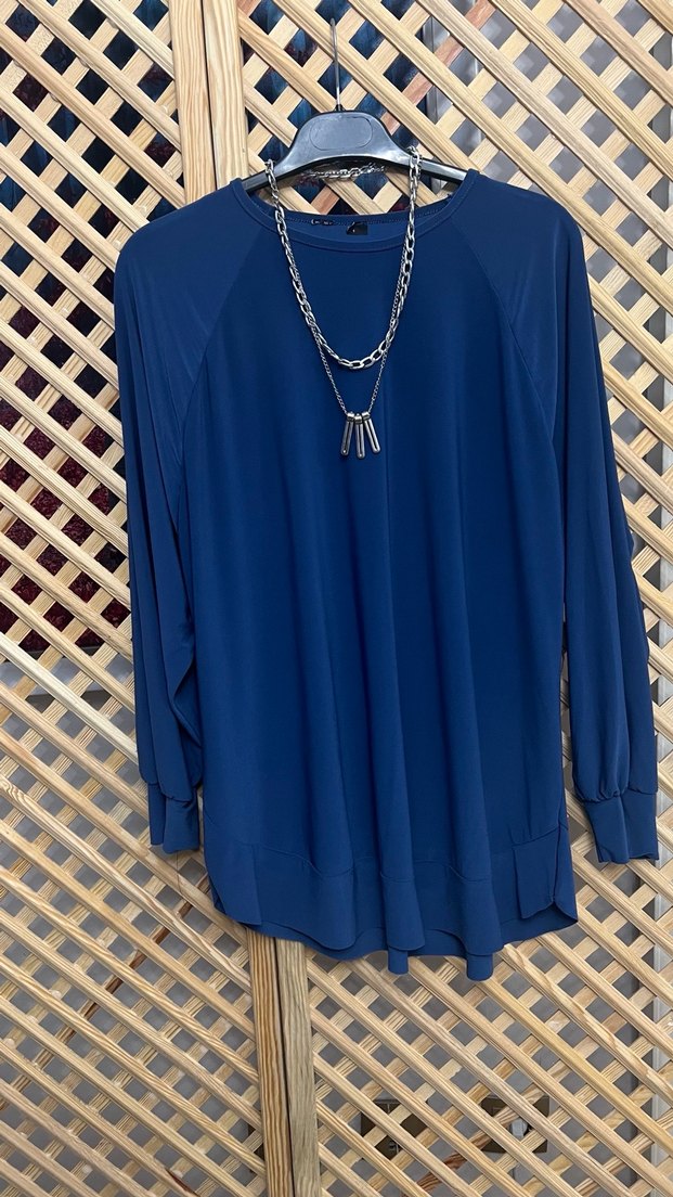 Parlak mavi renkte, uzun kollu ve yuvarlak yakalı, zincir detaylı bol kesim kadın tunik. Sentetik kumaştan, günlük rahat kullanım için uygundur. Bir beden 36 44 uyumludur iki beden 46 48 uyumludur