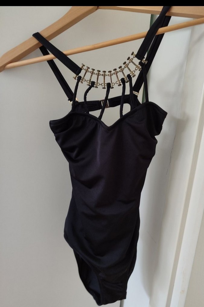 ince askılı ve vücuda oturan zincir detaylı sırt dekolteli mayo Göğüs cupları mevcuttur . takılıp çıkarılabilir.Koton marka