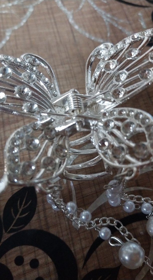 Gri ve beyaz tonlarda, zincir ve inci detaylı metal kelebek saç tokası, bohem ve gösterişli tarzı bir araya getirir.