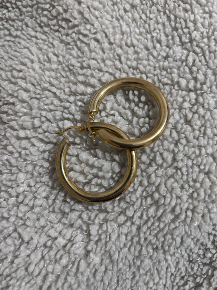 Zincir detaylı, parlak yüzeyli midi uzunlukta altın renk halka küpeler. Günlük kullanım için klasik ve sokak stili uyumlu.