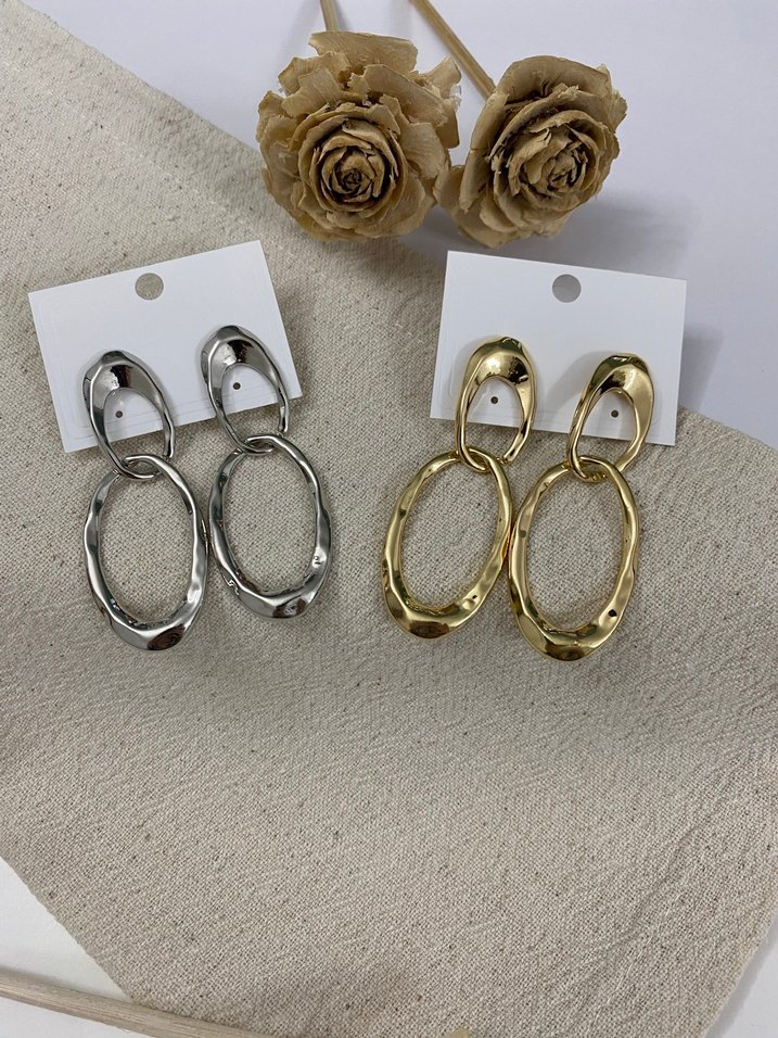 Parlak altın renkte, zincir detaylı modern klasik tasarıma sahip midi uzunlukta sade küpeler. Düğün için uygun minimal stil.