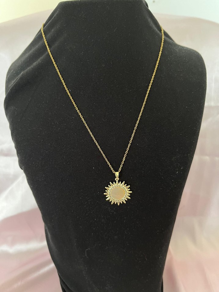Zincir detaylı altın renkli, midi uzunlukta güneş kolye, sade ve cesur tarzı tamamlar, günlük sokak giyimi için uygundur.