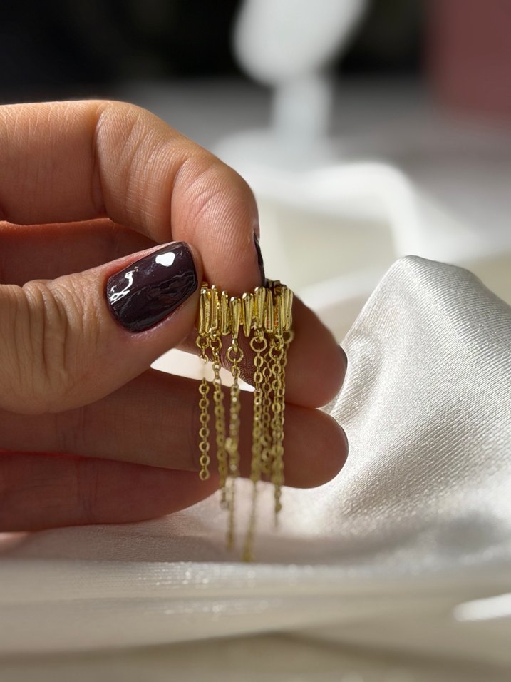 Zincir detaylı mini altın küpe, parlak yüzey ve nakış deseniyle. Günlük kullanım için minimalist ve bohem tarzda.