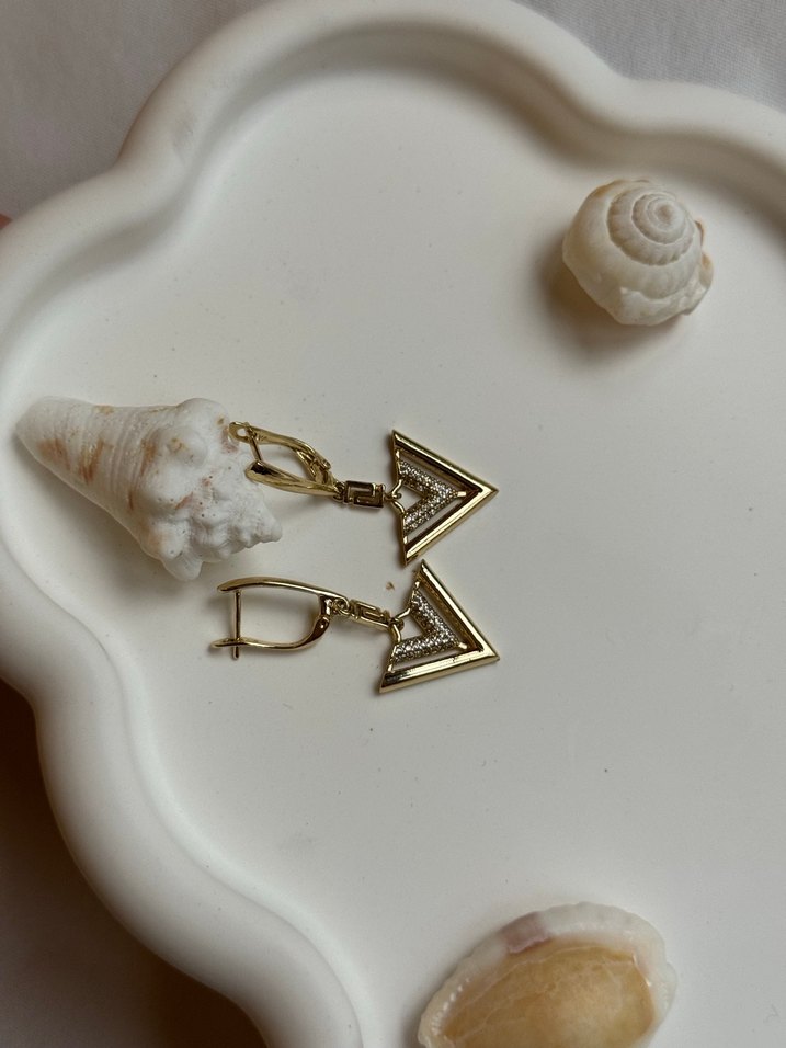 Zincir detaylı, parlak üçgen desenli kısa altın küpeler, göz alıcı ve yenilikçi tarzlar için ideal.