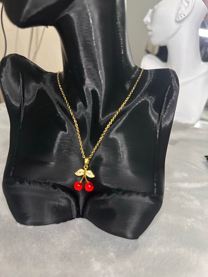 Kısa uzunlukta, zincir detaylı altın renkli kolye, parlak kırmızı baskılı kiraz figürüyle cesur sokak stili için uygun. Çeliktir kararma yapmaz