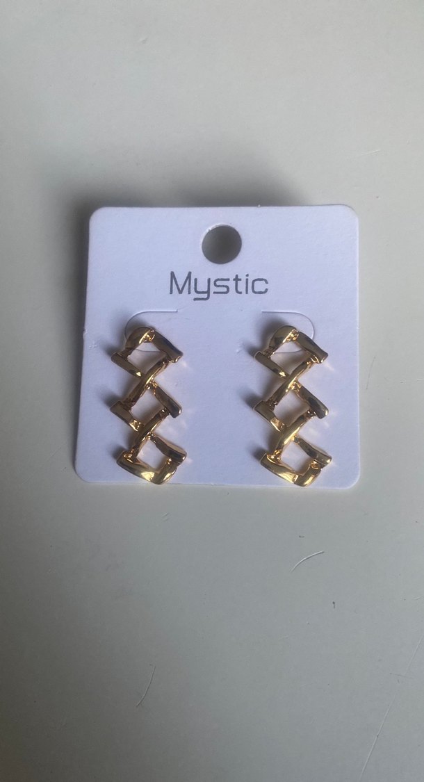 Günlük kullanıma uygun, zincir detaylı, yılan desenli, parlak altın renkte kısa küpeler. Marka: Mystic.