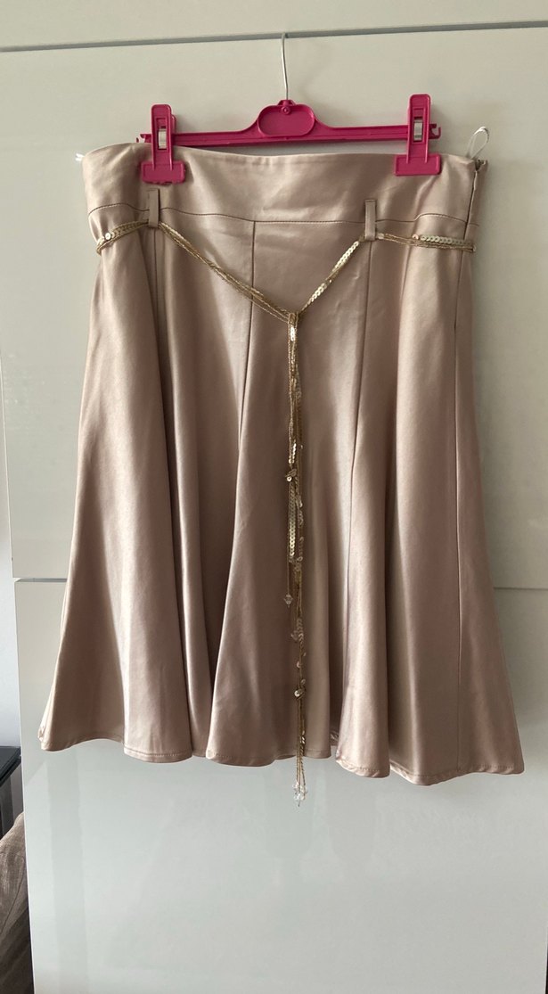Bej renkli hafif parlak kalın saten likrası da mevcut etek, hafif parlak ve saten dokuda, bol kloş kesimdir. Belinde işlemeli boncuk zincir kemer bohem tarzı yansıtır. Saten ince astarı vardın bej açık kahve arası rengi Şıklığı sevenler için uygundur. Sadece bir defa giyildi Beden değişikliği nedeniyle veriyorum Ölçüleri fotoğrafta mevcuttur İade yoktur